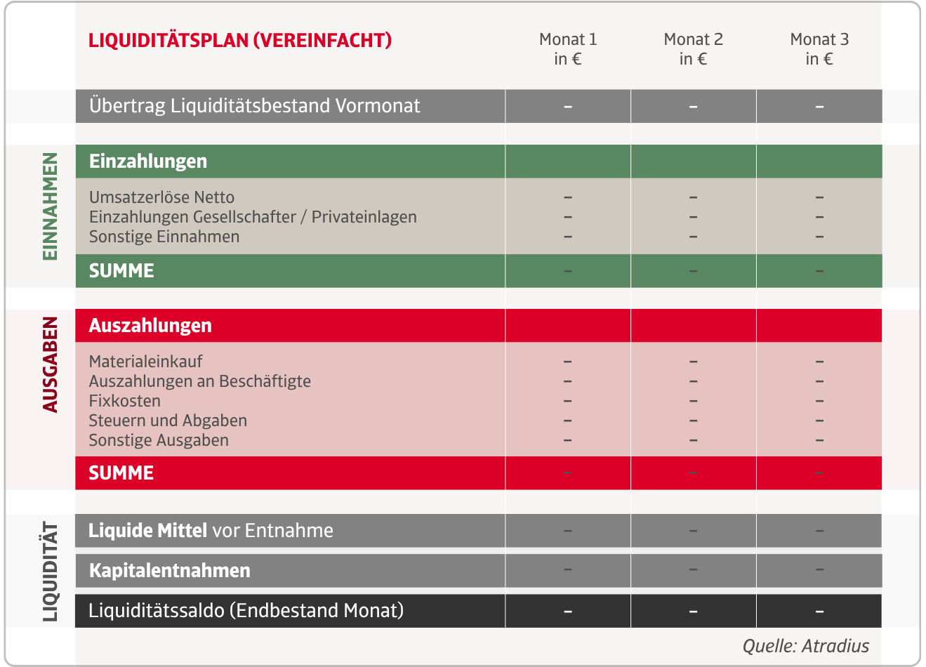 - geplante Auszahlungen, darunter Fixkosten, variable Kosten, Tilgungen, Investitionen und Steuerzahlungen