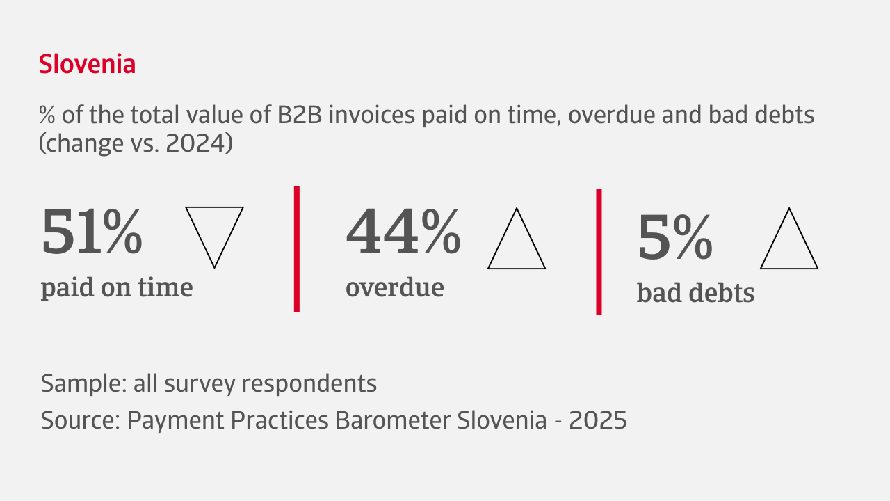 Our survey reveals increasingly challenging payment conditions in Slovenia, with most companies reporting a noticeable deterioration in the payment behaviour of B2B customers during recent months. A shift toward longer payment cycles is becoming more frequent, with overdue invoices now accounting for an average 44% of all B2B sales. The most cited cause is customer liquidity issues. Bad debts average 5% of all B2B invoices, a financial strain which is particularly acute in the automotive industry.
