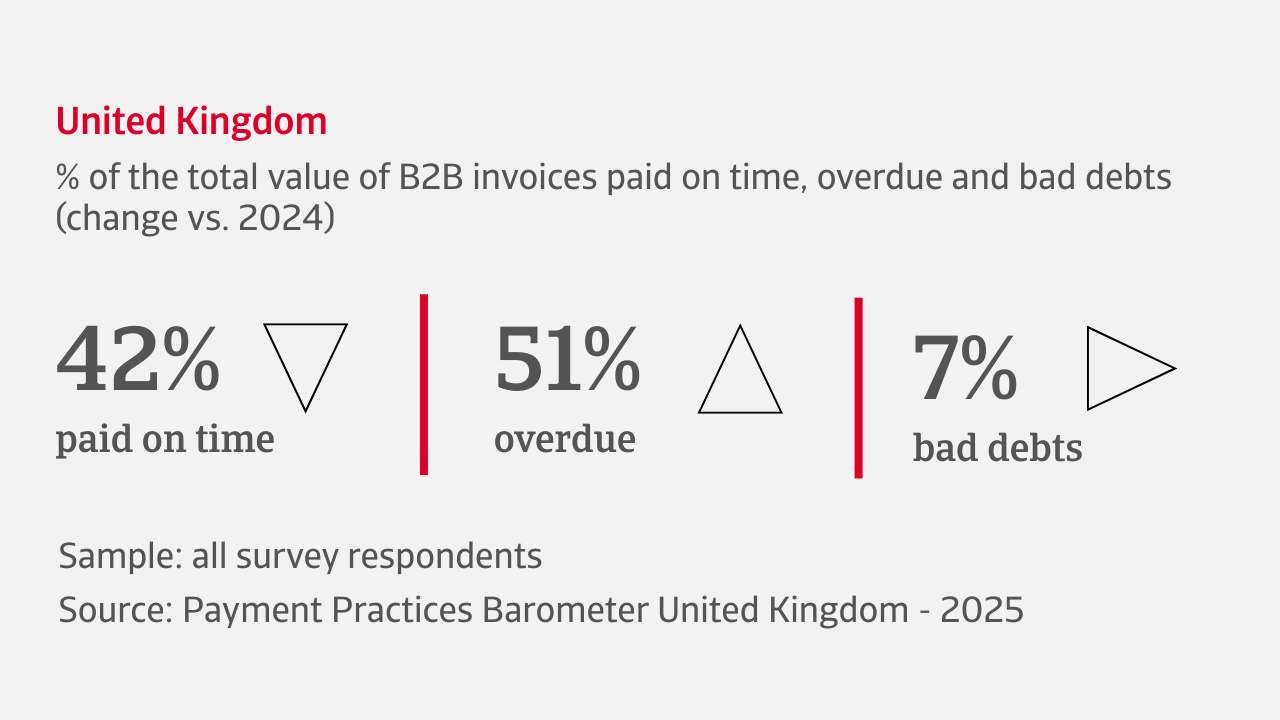 The payment behaviour of business-to-business (B2B) customers in the United Kingdom has remained largely unchanged in recent months, with payment delays still widespread across the market. 51% of B2B invoices are currently overdue, the consumer durables sector impacted in particular. Bad debts account for 7% of all B2B invoices, continuing to strain the financial health of companies, notably in the agri-food industry.
