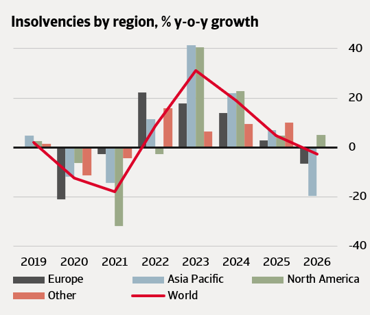 Global insolvencies are forecast to rise by 5% in 2025, followed by a 3% year-on-year decline in 2026.