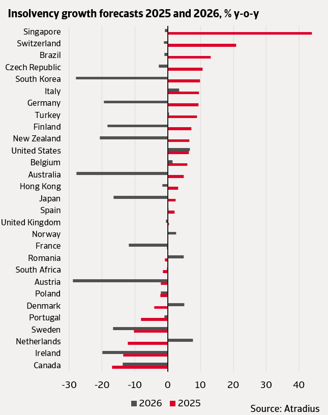 In Germany, where insolvencies have reached their highest level since 2015, the adjustment is likely to begin later. We expect a continued increase of 9% in 2025, followed by a sharp decline of 19% in 2026. This projected decline in 2026 reflects the completion of the shakeout of companies that struggled to remain competitive after the pandemic years.