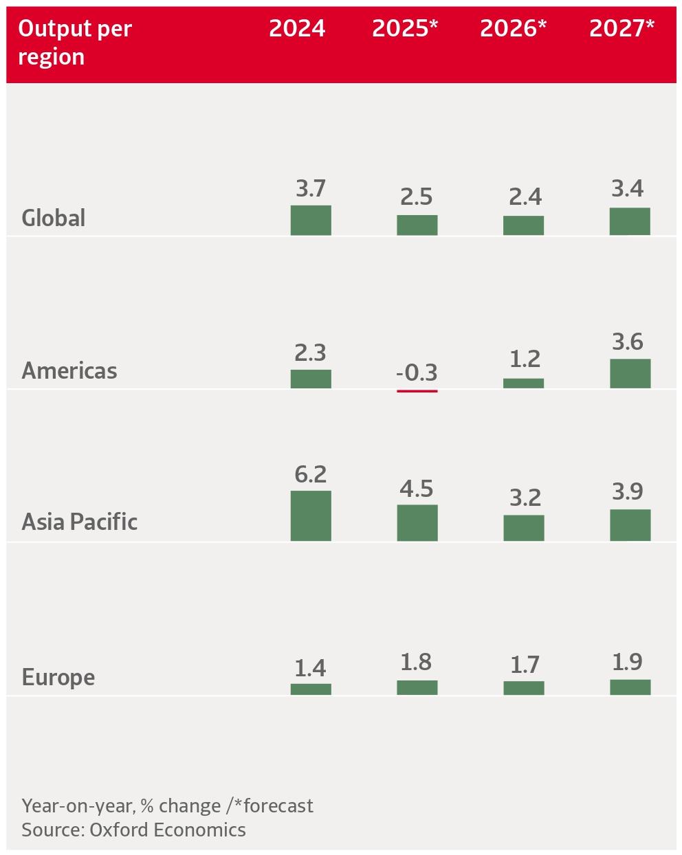 - In the US, the sector faces challenges from trade distribution, labour shortages, and geopolitical instability. We expect sector output to decrease by 0.6% in 2025, followed by a modest 1% rebound in 2026